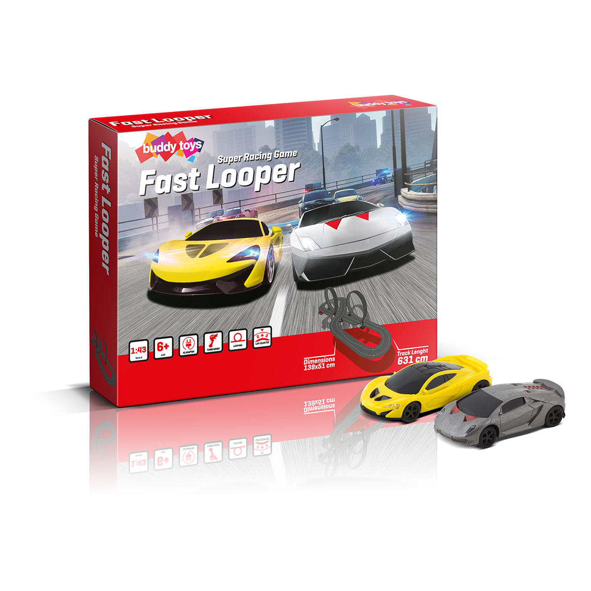 Autodráha s dĺžkou 630 cm je vybavená dvoma pretekárskymi autíčkami s výkonným motorom a silným magnetom, vyrobenými v obľúbenom mierke 1:43. Autodráhový systém je analógový, napájaný sieťovým adaptérom, opatrený ovládačom s turbom.