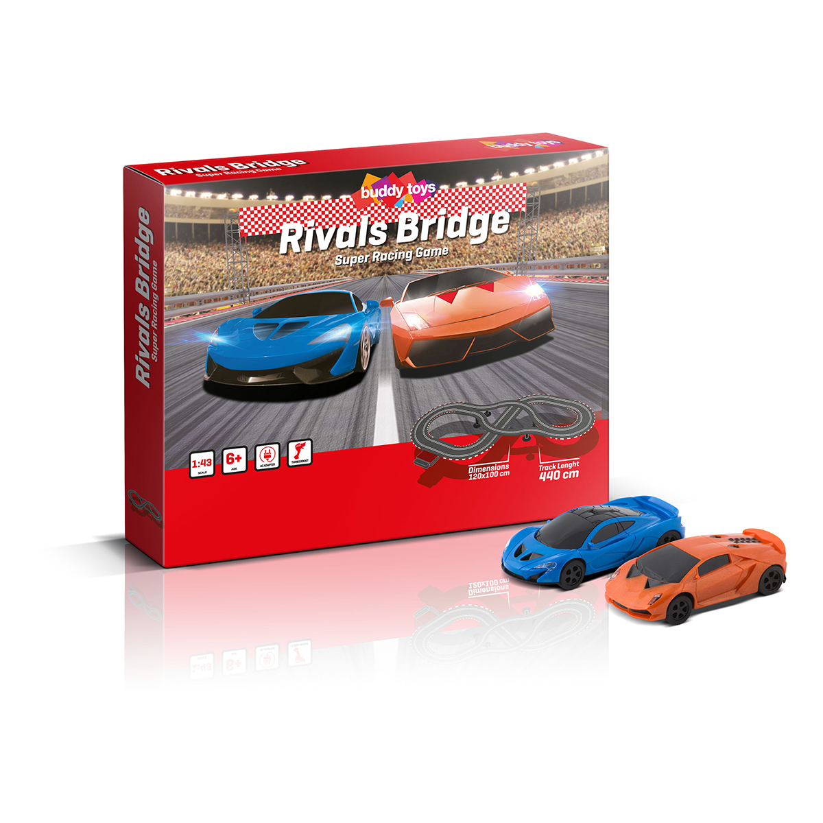 Autodráha s dĺžkou 440 cm je vybavená dvoma pretekárskymi autíčkami s výkonným motorom a silným magnetom, vyrobenými v obľúbenom mierke 1:43. Autodráhový systém je analógový, napájaný sieťovým adaptérom, opatrený ovládačom s turbom.