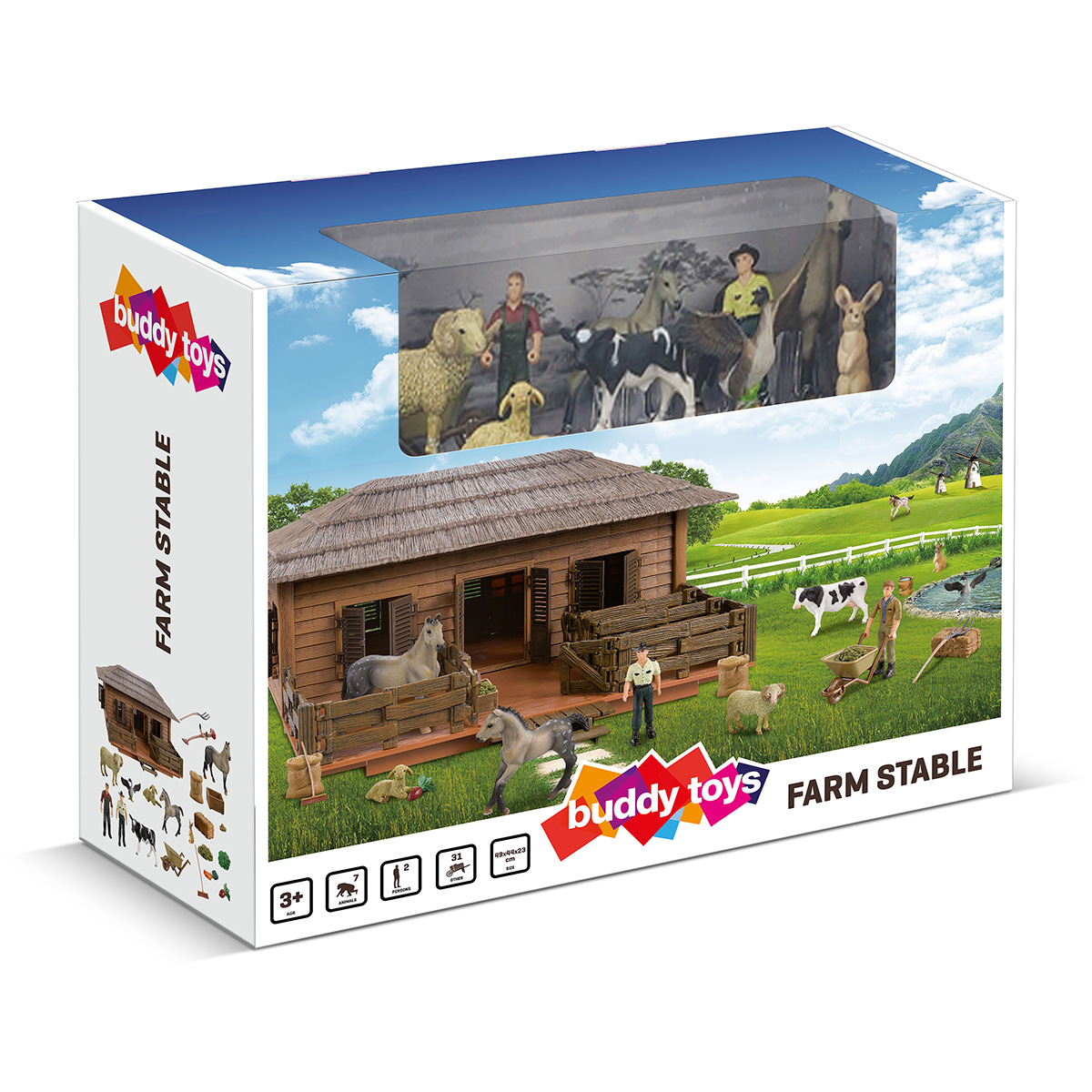 Stajňa pre kone a domáce zvieratá Rozmery prístrešku 58 x 24 x 28 cm Vyrobené z kvalitného a odolného plastu Súčasťou balenia sú zvieratká, figúrky a veľa príslušenstva Vhodné pre deti od 3 rokov.