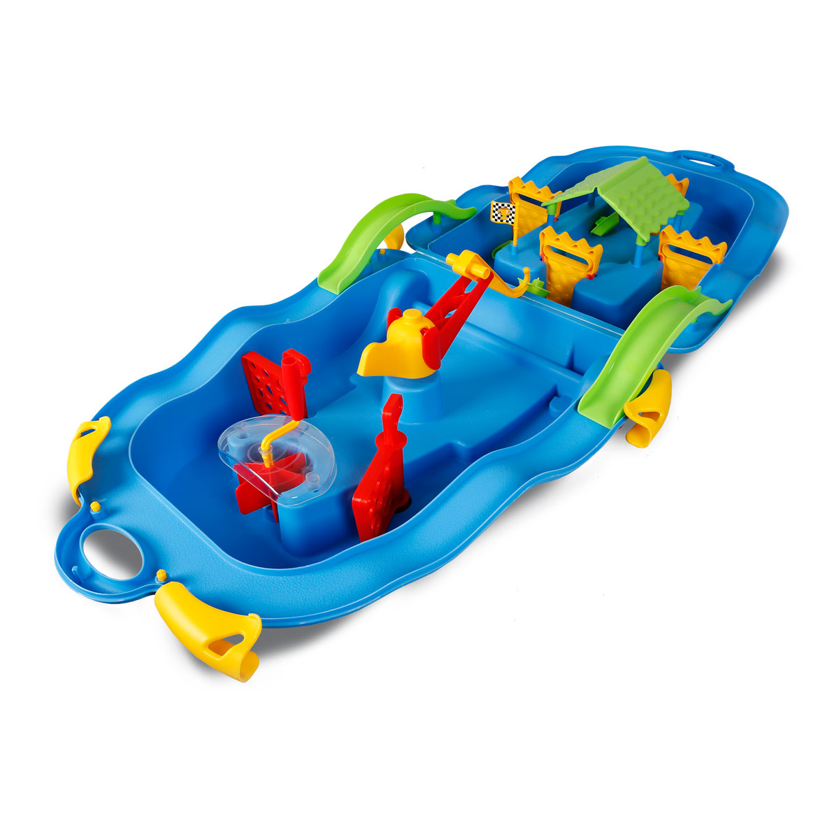 Vodná dráha s mostom a žeriavom. Všetko je uložené v praktickom kufríku na kolieskach. Ľahké zmontovanie pomocou klipov, ručná kľuka pre tvorbu prúdenia. Vhodné pre deti od 3 rokov